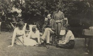Left to right: Lady Ottoline Morrell, Maria Nys (later Mrs. Aldous Huxley), Lytton Strachey, Duncan Grant and Vanessa Bell (Blomomsbury members)